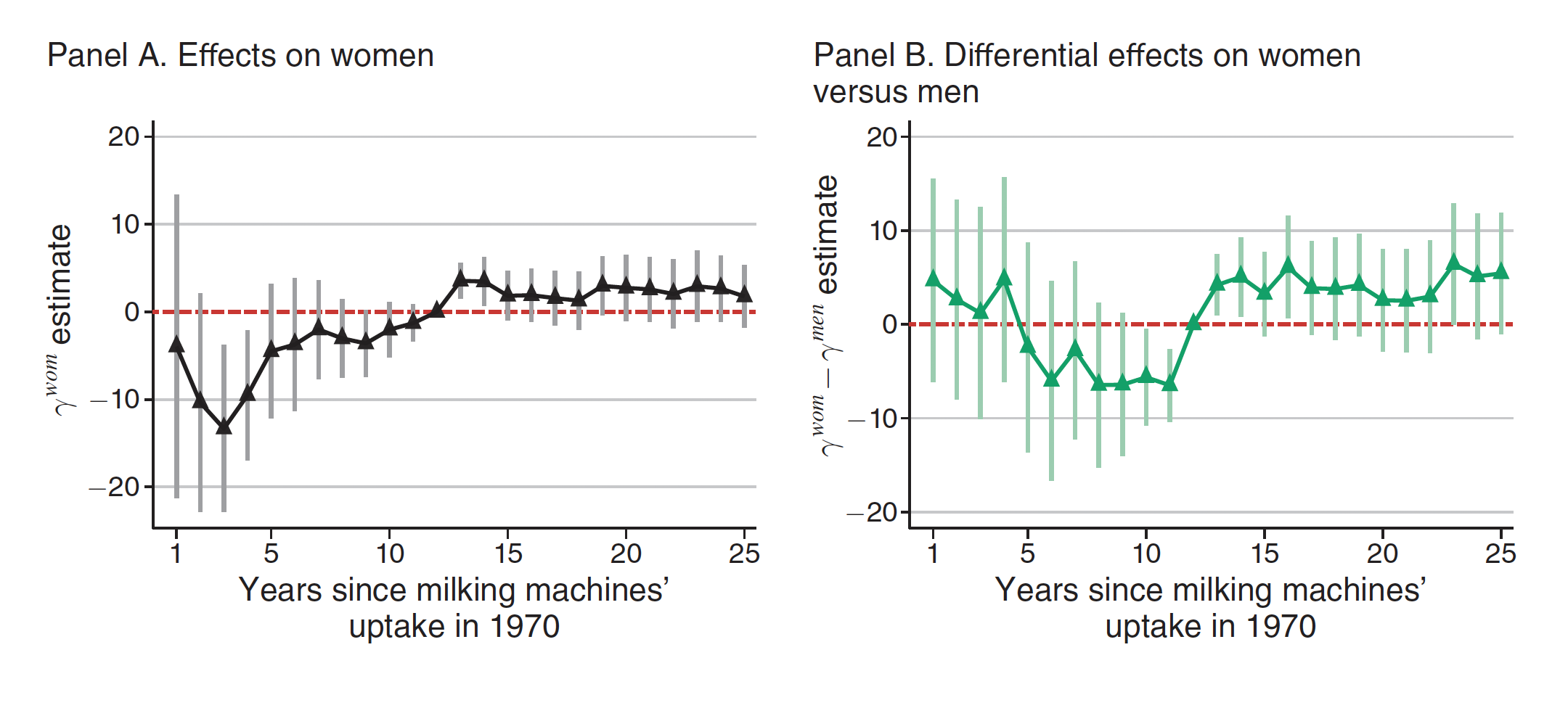 Panel A shows the effect on women's income percentile rank relative to municipalities with lower adoption of milking machines in 1970. During the first five years, women from areas with high adoption experienced income declines of 4 to 13 percentile ranks per each additional milking machine per farm. However, a reversal begins around year 15, and, by 20 to 25 years after the technology shock, women from high-adoption municipalities consistently ranked higher in the income distribution than their counterparts from areas with fewer machines.