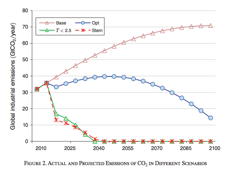 The figure above shows emissions projections in four different scenarios. The first is the business as usual approach (represented by the pink triangles), where nothing is done and we have no climate policy. Then there is the “cost-benefit economic optimum” (blue circles), which optimizes current climate policy indefinitely. The two more aggressive approaches are limiting the long-term temperature increase to 2.5 degrees Celsius (green triangles) and a “Stern” policy (red stars) that takes immediate and aggressive steps in order to preserve our current quality of life for future generations (red stars).