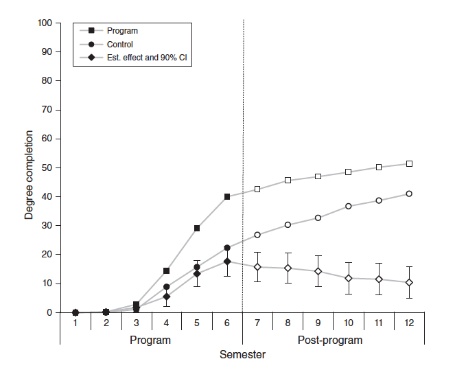 The narrowing gap after the program ends implies that part of the 18 percentage point effect was the result of speeding up the timeline for students who would have graduated anyway. Students who otherwise would have taken five or six years to get their degree were able to graduate in two or three years.