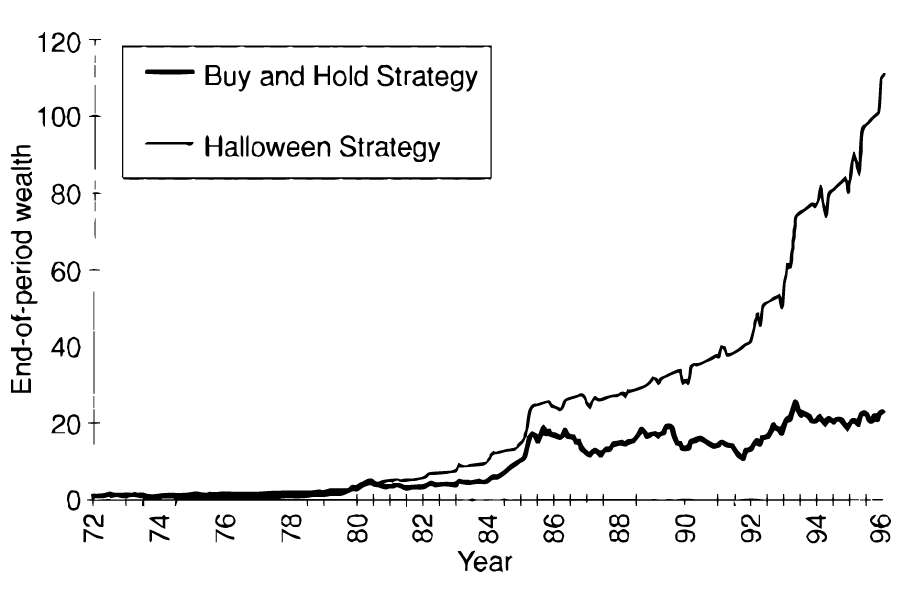 Ben Jacobsen of TIAS and Sven Bouman of Saemor Capital looked at the stock market returns of thirty-seven countries to determine if holding only stocks from October 31 until April 30 and only low-risk bonds the other half the year — the “Halloween” strategy — outperformed a “buy-and-hold” strategy that passively tracks the market.