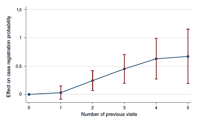 The figure above shows how police responded to the decoys posing as crime victims. Each visit from a decoy (plotted along the x-axis) resulted in a 22 percent increase in the probability that a subsequent complaint would be registered. By the time an office received a visit, the registration rate was close to 75 percent. Police officers also treated victims more politely, according to the authors.