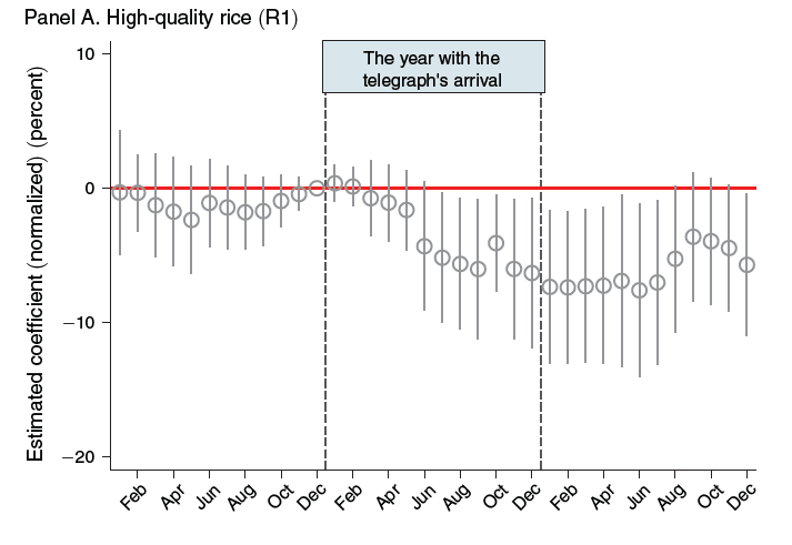 Panel A from Figure 3 shows the differences in the maximum prices for high-quality rice between telegraph-connected regions and non-connected regions. The hollow circles are the estimated coefficients and the vertical lines are the 95 percent confidence intervals. In the 12 months before the telegraph arrived, there were virtually no regional differences in the maximum prices. But in regions connected by telegraph, there was a sharp decline in extreme prices after the technology was introduced.