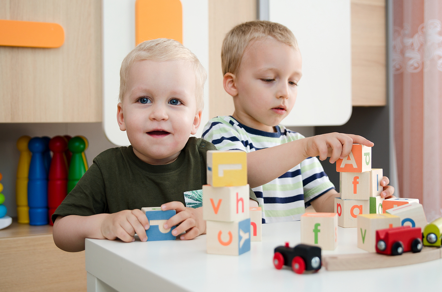 Preschool-aged children play with toys at a child care center.