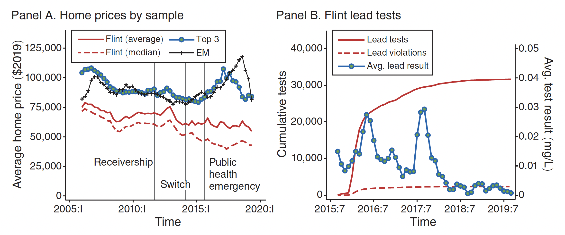 Using a difference-in-differences approach, the researchers compared the evolution of home prices in Flint to three other cities with similar demographics and economic histories: Youngstown, Ohio; Pontiac, Michigan; and Camden, New Jersey.