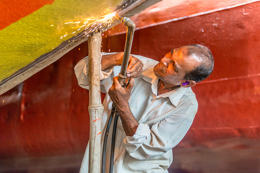 A worker repairs a ship in Dhaka, Bangladesh.
